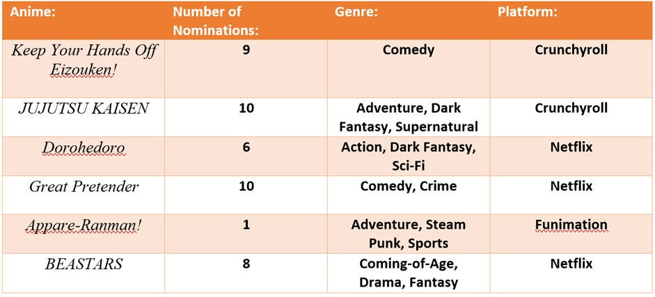 The nominees for Anime of the Year are: